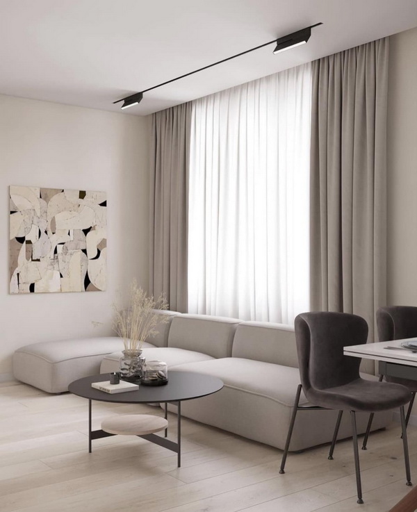 Không gian hiện đại tối giản: rèm cuốn màu đơn sắc hoặc tông xám/đen.